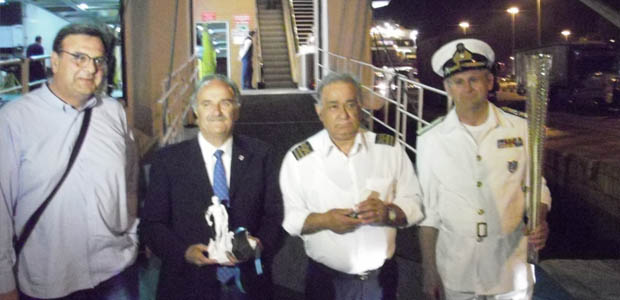 Κατά την άφιξη της Φλόγας στο ΕΛΥΡΟΣ, διακρίνονται από αριστερά ο κος Ισίδωρος Κούβελος, Αρχηγός της ελληνικής αποστολής στους Ολυμπιακούς Αγώνες του Λονδίνου & Πρόεδρος της Διεθνούς Ολυμπιακής Ακαδημίας, ο κος Σπύρος Ζαννιάς, Πρόεδρος της Επιτροπής Ολυμπιακής Λαμπαδηδρομίας, ο καπετάν Μπάμπης Πετράς, πλοίαρχος του “ΕΛΥΡΟΣ” και ο Αρχηγός του Λιμενικού Σώματος Αντιναύαρχος Σούλης Κωνσταντίνος.