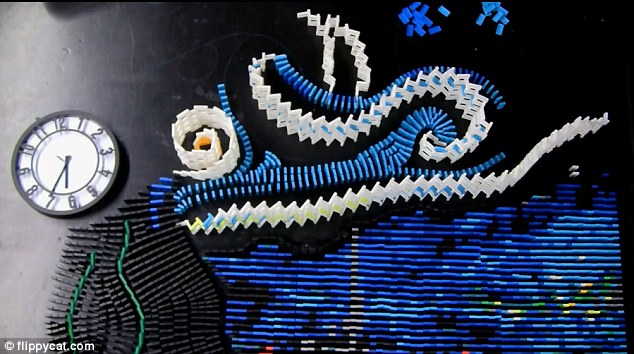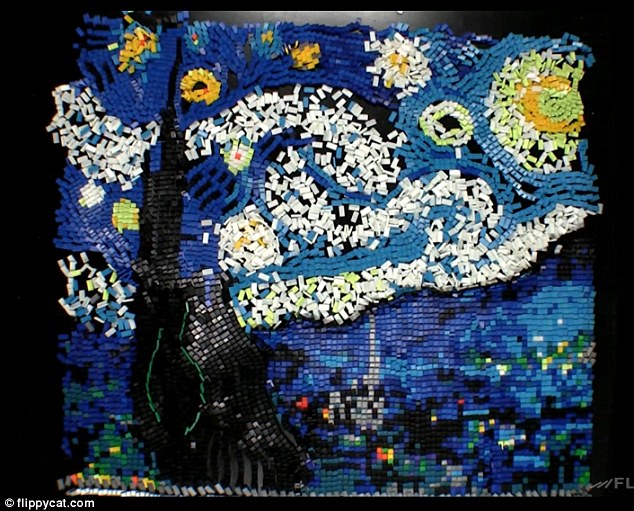 Ο καλλιτέχνης με το ψευδώνυμο FlippyCat είχε το ταλέντο και την ψυχραιμία να αναπαραστήσει το αριστούργημα του Βίνσεντ βαν Γκογκ «Έναστρη Νύχτα» με 7.000 κομματάκια του ντόμινο! Χρειάστηκε περισσότερες από 11 ώρες για να ολοκληρώσει το έργο του το οποίο ωστόσο... ισοπέδωσε σε λίγα μόλις λεπτά δίνοντας ζωή στην εικόνα του και δημιουργώντας την οφθαλμαπάτη μιας έναστρης νύχτας με ζωή και κίνηση.