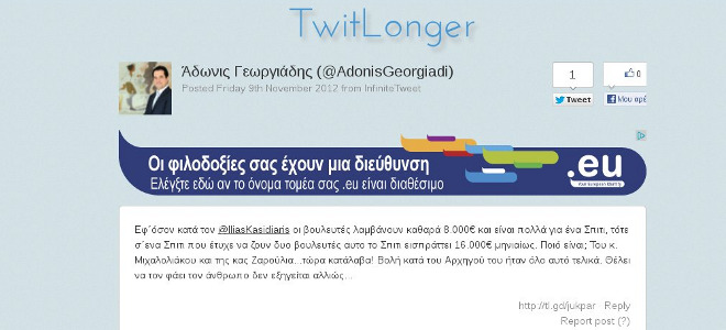 Μέσω twitter ο κ. Γεωργιάδης υποστήριξε πως αν για τον Ηλία Κασιδιάρη είναι πολλά τα 8.000 ευρώ που αμείβονται τα μέλη του Κοινοβουλίου (σύμφωνα με τα όσα υποστηρίζει ο δεύτερος) για ένα σπίτι, τότε είναι πάρα πολλά τα 16.000 ευρώ που μπαίνουν όταν σε ένα σπίτι υπάρχουν δύο βουλευτές.