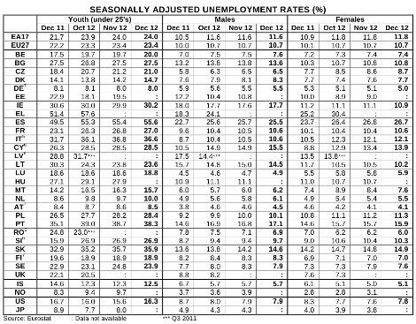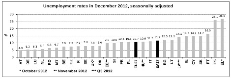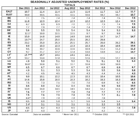 Το Δεκέμβριο του 2012, η ΕΕ είχε 25,926 εκατομμύρια άνεργους, εκ των οποίων 18,715 εκατομμύρια στην ευρωζώνη. Σε ένα έτος, δηλαδή το διάστημα Δεκέμβριος 2011 - Δεκέμβριος 2012, η ανεργία αυξήθηκε κατά 1,796 εκατομμύρια άτομα στη ζώνη του ενιαίου νομίσματος.
