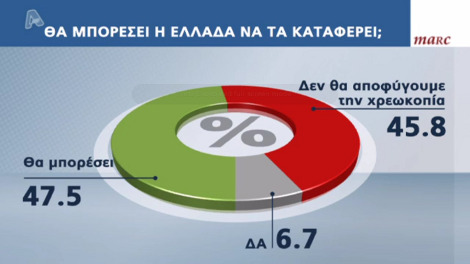 Ένα ποσοστό 47,5% των πολιτών εκτιμά πως η Ελλάδα θα καταφέρει να βγει από την κρίση που αντιμετωπίζει, με το 45,8% να πιστεύει πως δεν θα αποφύγουμε τη χρεωκοπία.