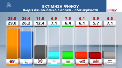 Δημοσκόπηση Marc: ΣΥΡΙΖΑ 23%, ΝΔ 20,8% - Σταθερά 3ο κόμμα η Χρυσή Αυγή