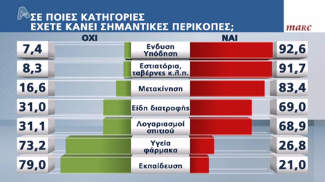 Στα υπόλοιπα ερωτήματα που τέθηκαν στους συμμετέχοντες στη δημοσκόπηση της Marc, το 92,5% δηλώνει πως το οικογενειακό του εισόδημα έχει μειωθεί από την έναρξη της οικονομικής κρίσης, την ώρα που μόλις το 0,2% έχει δει αύξηση στο οικογενειακό εισόδημά του.