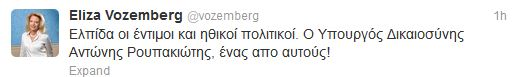 Μέσω διαδικτύου αποφάσισε να εκφράσει τη συμπαράστασή της στον υπουργό Δικαιοσύνης η Ελίζα Βόζεμπεργκ γράφοντας στο λογαρισμό της στο twitter «Ελπίδα οι έντιμοι και ηθικοί πολιτικοί. Ο Υπουργός Δικαιοσύνης Αντώνης Ρουπακιώτης, ένας απο αυτούς».