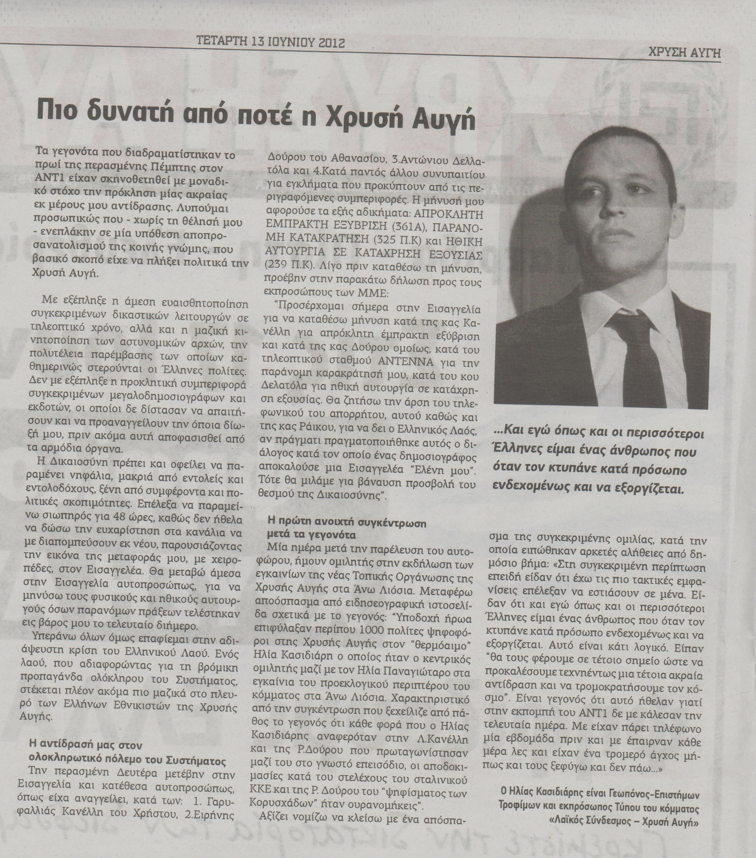 Στο άρθρο του που δημοσιεύεται σήμερα στην εφημερίδα της Χρύσης Αυγής και έχει τίτλο «Πιο δυνατή από ποτέ Χρυσή Αυγή», ο κ. Κασιδιάρης τονίζει ότι «τα γεγονότα που διαδραματίστηκαν το πρωί της περασμένης Πέμπτης στον ΑΝΤ1 είχαν σκηνοθετηθεί με μοναδικό στόχο την πρόκληση μίας ακραίας εκ μέρους μου αντίδραση».
