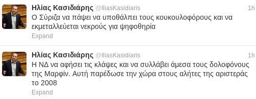 Σκληρή επίθεση κατά του ΣΥΡΙΖΑ αλλά και της Νέας Δημοκρατίας έκανε μέσω Twitter ο εκπρόσωπος Τύπου της Χρυσής Αυγής, Ηλίας Κασιδιάρης, σήμερα με αφορμή τα τέσσερα χρόνια από την άνανδρη δολοφονία του Αλέξη Γρηγορόπουλου.
