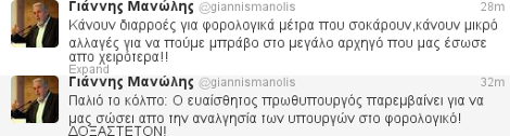 Την καθιερωμένη πλέον επίθεση στην κυβέρνηση μέσω twitter εξαπέλυσε το στέλεχος των Ανεξάρτητων Ελλήνων Γιάννης Μανώλης, ο οποίος με αφορμή το φορολογικό επέκρινε τον πρωθυπουργό Αντώνη Σαμαρά.