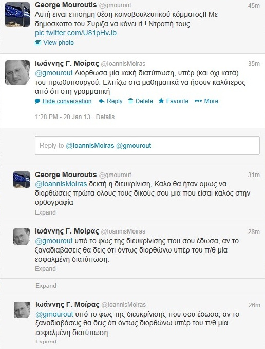 Στη συνέχεια, ο κ.Μοίρας εξήγησε στον κ.Μουρούτη τι ακριβώς ήθελε να πει με το σχόλιό του: «Διόρθωσα μια κακή διατύπωση, υπέρ (και όχι κατά) του πρωθυπουργού» έγραφε λέγοντας του σκωπτικά: «Ελπίζω στα μαθηματικά να ήσουν καλύτερος από ότι στη γραμματική».