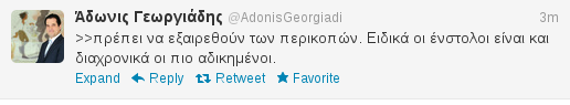 Με μήνυμά του στο twitter, ο κ. Γεωργιάδης σημειώνει πως οι ένστολοι πρέπει να εξαιρεθούν από τις περικοπές καθώς είναι διαχρονικά «οι πιο αδικημένοι». Μάλιστα σε προηγούμενο σχόλιό του, ο βουλευτής της ΝΔ είχε εκφράσει την άποψη ότι το Κράτος οφείλει να προστατεύει το σκληρό πυρήνα του imperium του, δηλαδή τους Δικαστές και τους Ένστολους.