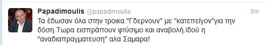 «Τα έδωσαν όλα στην Τρόικα. "Γδέρνουν" με "κατεπείγον" για την δόση. Τώρα εισπράττουν φτύσιμο και αναβολή. Ιδού η "αναδιαπραγμάτευση" αλα Σαμαρά!», σημειώνει με νόημα ο κοινοβουλευτικός εκπρόσωπος του ΣΥΡΙΖΑ, με σχόλιό του στον προσωπικό του λογαριασμό στο Twitter.