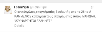 Εγραψε χαρακτηριστικά: «Ο ανεπάγγελτος επαγγελματίας βουλευτής από τα 26 του ΚΑΜΜΕΝΟΣ καταγγέλλει επαγγελματίες τύπου Μανώλη. Ασυνάρτητοι Ελληνες».