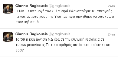 Πιό συγκεκριμένα στο μήνυμα που ανήρτησε στο twitter ο Γιάννης Ραγκούσης λέει ότι: «η ΝΔ,με υπουργό τον κ. Σαμαρά ελληνοποίησε 10 απεργούς πείνας αντίστοιχους της Υπατίας, εγώ αρνήθηκα να υποκύψω στον εκβιασμό.