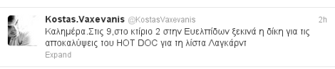 Ο εκδότης του HOTDOC ανάρτησε σήμερα στο λογαριασμό του twitter: «Η Δίκη θα γίνει στο κτίριο 2 στην Ευελπίδων. Σύμφωνα με τα ξένα Μ.Μ.Ε, δικάζεται η ελευθερία του Τύπου στην Ελλάδα».