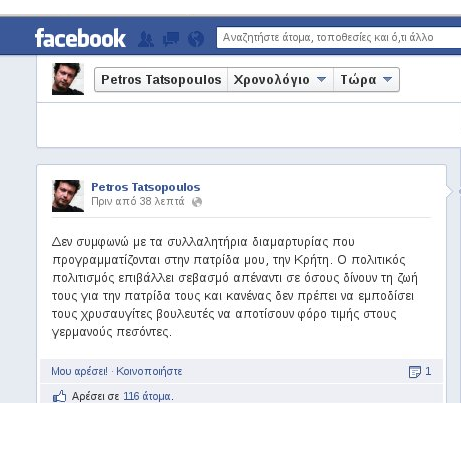 «Δεν συμφωνώ με τα συλλαλητήρια διαμαρτυρίας που προγραμματίζονται στην πατρίδα μου, την Κρήτη» σημειώνει ο κ. Τατσόπουλος με ανάρτησή του στο προφίλ του στο Facebook και συνεχίζει: