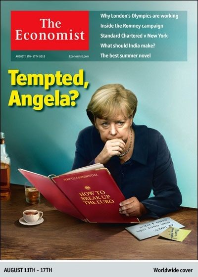 Στην έκδοση της 11ης Αυγούστου, το γνωστό περιοδικό δείχνει στο εξώφυλλό του τη Γερμανίδα καγκελάριο να διαβάζει με... σπουδή ένα βιβλίο που φέρει τον τίτλο «Πως να διαλύσετε το ευρώ» ενώ ο Economist διερωτάται στον τίτλο του «Άνγκελα έχεις μπει σε πειρασμό;»