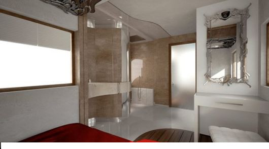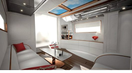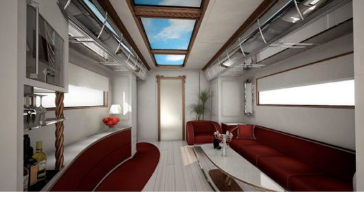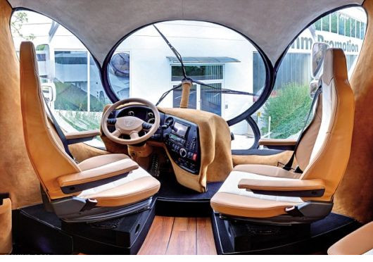 Εσωτερικά δεν έχει τίποτα να ζηλέψει απο ένα ακριβό ξενοδοχείο, αφου πέρα απο την ταράτσα 20 τετραγωνικών μέτρων, την ενδοδαπέδια θέρμανση και το μπαρ, έχει ένα μεγάλο master υπνοδωμάτιο με τηλεόραση 40 ιντσών, ένα μεγάλο μπάνιο με ντουζιέρα, ξεχωριστό WC, σαλόνι και πολυτελή καμπίνα για τον οδηγό με κουκέτα, ενω μπορεί να εξοπλιστεί με mobile internet, τζάκι, κλειστό σύστημα παρακολούθησης και δορυφορική τηλεόραση!