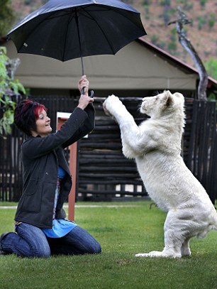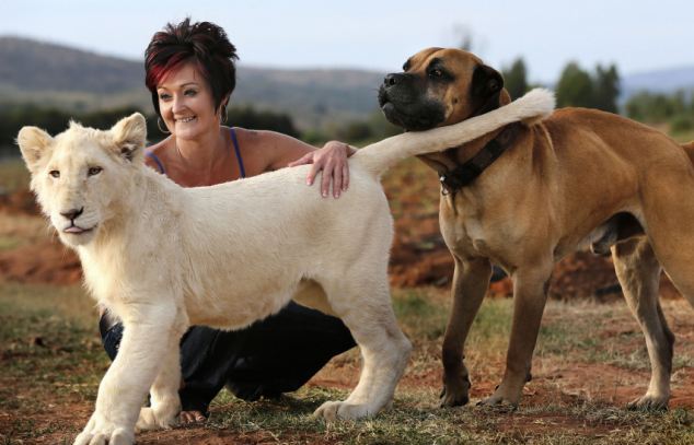 Το λευκό λιοντάρι που έχει σπίτι της συμβιώνει ευχάριστα μαζί με το άλλο κατοικίδιό της τον σκύλο της.